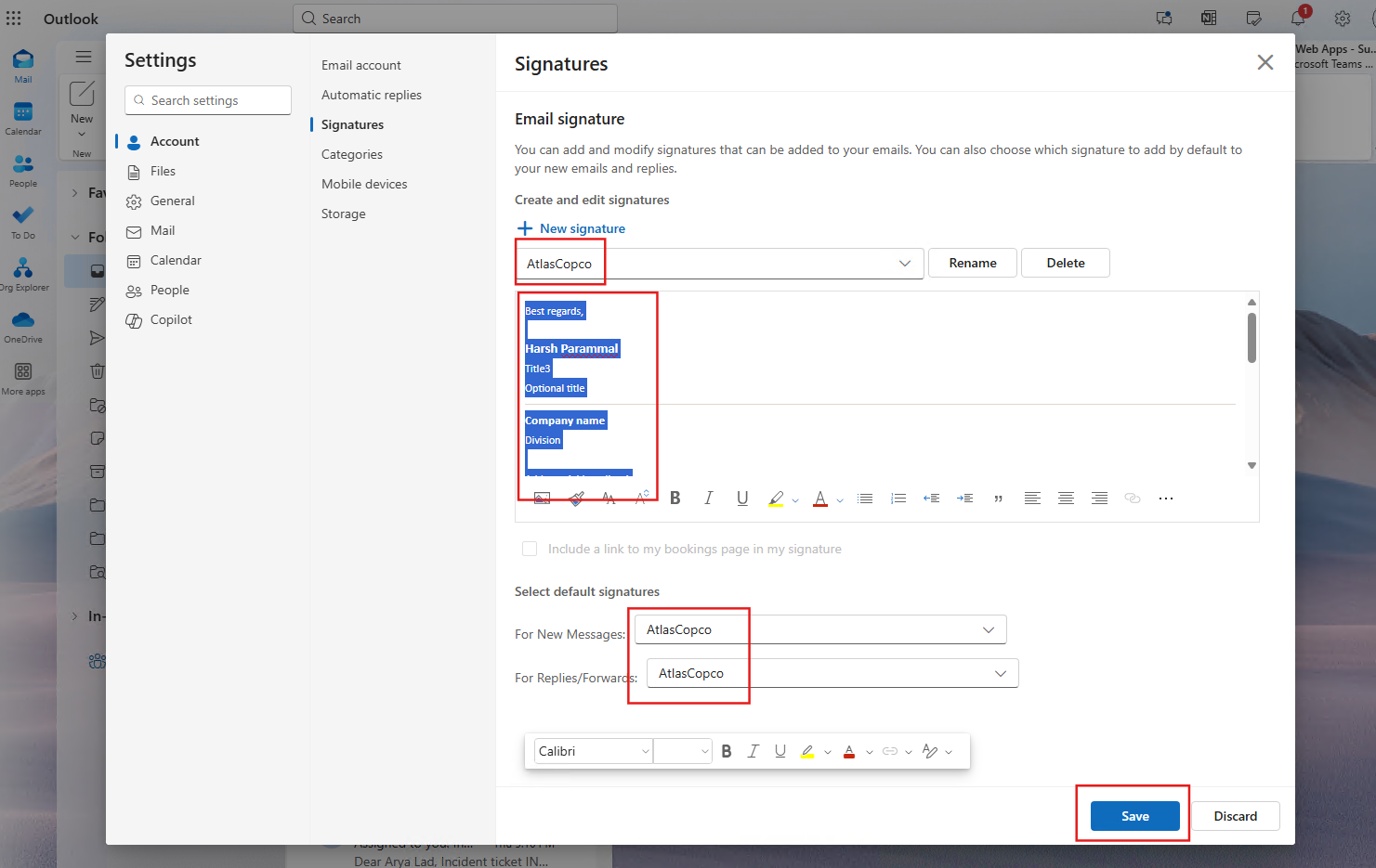 - Verify the name in the fields "New Messages" and "Replies/forwards"