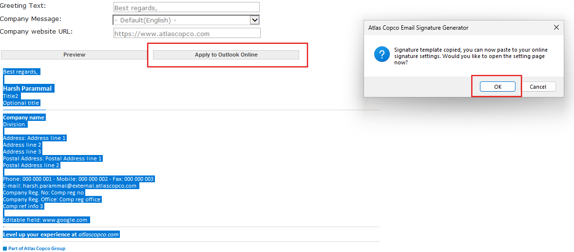 - Verify the name of the signature "AtlasCopco", if it is blank / empty then select it from dropdown or type in the name "AtlasCopco"